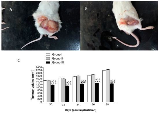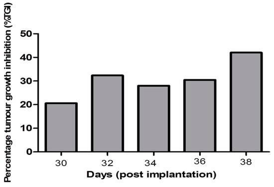 Compared to the control Group I and Group II (treated with 10 mg kg−1 free peptide), there was a significant decrease in the tumor volume of Group III mice (treated with 10 mg kg−1 of N-terminal peptide-loaded NP) at all recording points after 18 days from starting the treatment. Macroscopic pictures showed a significant reduction in tumor volume following treatment with peptide-loaded NPs when compared to treatment with free peptide (Figure 9A,B). Tumor volumes of Group II exhibited an insignificant decrease at all recording points of the experiment (Figure 9C). The % tumour growth inhibition (TGI) in Group III was 20% after 18 days of treatment and gradually increased to 42% at the end of the experiment (Figure 10).
