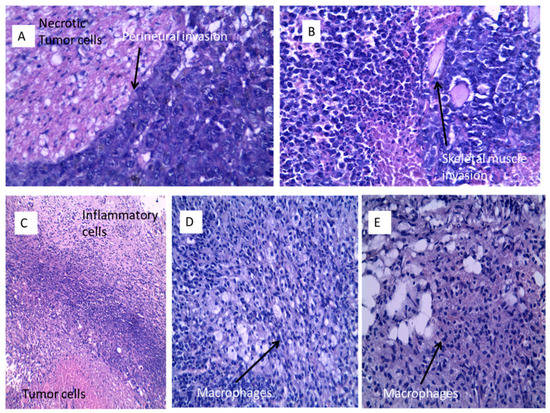 Histopathological examination of the studied groups revealed the typical picture of Solid Ehrlich carcinoma (Figure 11A–E). Examination of sections prepared from the tumor tissue of the control Group I showed anaplastic malignant ductal undifferentiated carcinoma cells with pleomorphic changes, increased nucleo/cytoplasmic ratio and perineural invasion (Figure 11A, H&E ×400). Sections prepared from Group II (treated with 10 mg kg−1 of free peptide) showed anaplastic malignant ductal carcinoma cells with pleomorphism, increased nucleo/cytoplasmic ratio with skeletal muscle invasion and necrosis. The cells were spherical in shape, containing relatively large, highly chromatophilic nuclei with one or more prominent nucleoli. Giant tumor cells are also seen (Figure 11B, H&E ×400).