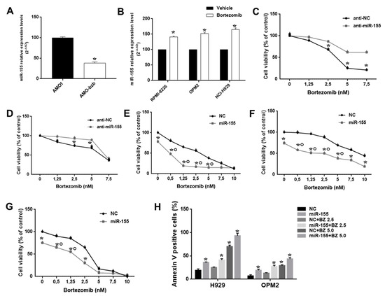 To further disclose the role of miR-155 in sensitivity of MM cells to bortezomib, its expression was enforced in RPMI-8226, NCI-H929, and OPM2 MM cells by transfection of miR-155 mimics, and 24 h later cells were exposed to increasing bortezomib concentrations. By CCK8 and Annexin V/7-AAD assay, we found that miR-155 mimics potentiated bortezomib activity in terms of both inhibition of cell viability and induction of apoptosis (Figure 3E–H, Figure S2).