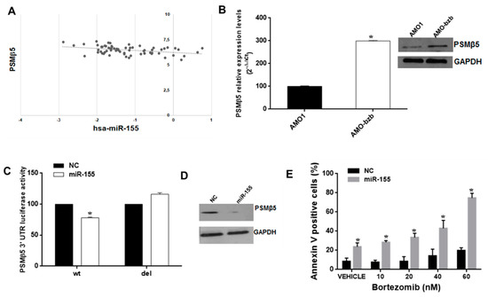 2.4. miR-155 Targets the Proteasome Subunit β5 (PSMβ5) and Sensitizes AMO-bzb Cell Line to Bortezomib