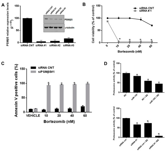 1 × 106 MM cells were electroporated with scrambled (miR-NC), synthetic pre-miR-155 (miR-155), siRNA control (siRNA CNT), and three different siRNAs against PSMβ5 (Invitrogen, Thermo Scientific, Invitrogen, Thermo Scientific, Carlsbad, CA, USA), at a final concentration of 100 nM, using Neon® Transfection System (Life Technologies) at 1150 V, 30 ms, 2 pulse setting.