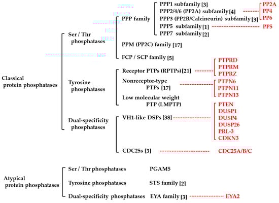 Protein phosphatases in human. Human phosphoprotein phosphatases (PPPs) are classified into two large classes as classical or atypical PPPs. And, these classes of PPPs are further grouped into families or subfamilies based on the amino-acid residue they dephosphorylate or their chemical structure. The PPPs focused in the text are written in red characters. Ser, Serine; Thr, Threonine; Tyr, Tyrosine; PPP, phosphoprotein phosphatase; PP2A, protein phosphatase 2A; PP2B protein phosphatase 2B; PP2C, protein phosphatase 2C; PPM, metal-dependent protein phosphatase; FCP, TFIIF-associating component of RNA polymerase Ⅱ carboxy-terminal domain phosphatase; PTP, protein Tyr phosphatase; LMPTP, low molecular weight PTP; VH1-like DSP [38], Vaccinia virus gene H1-like dual specificity phosphatase; PGAM5, phosphoglycerate mutase family member 5; Sts, suppressor of T-cell receptor signaling; EYA, eyes absent.