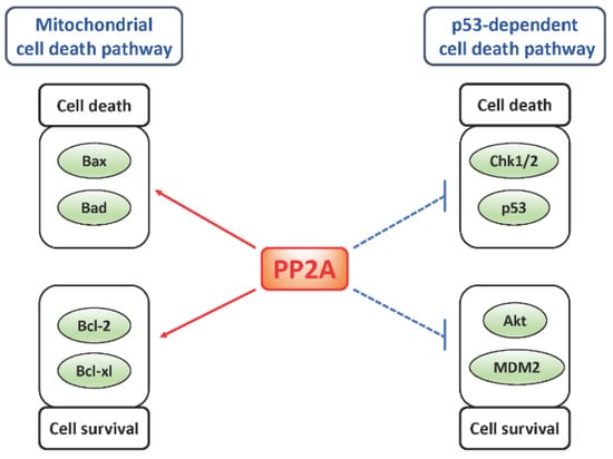 Multiple roles of protein phosphatase 2A (PP2A) in the regulation of cell death signaling. PP2A regulates both cell death-inducing and cell survival-inducing signaling simultaneously in not only mitochondria- but p53-dependent cell death cascade. In mitochondria-dependent cell death cascade, PP2A activates both pro-apopototic (Bax and Bad) and anti-apoptotic (Bcl-2 and Bcl-xl) Bcl-2 family proteins simultaneously by dephosphorylation. On the other hand, in p53-dependent cell death cascade, PP2A suppresses p53 inhibitor MDM2 and MDM2 activator Akt as well as p53 and p53 activator Chk1/2. Bcl-2, B cell lymphoma 2; Bcl-xl, B-cell lymphoma extra large; p53, tumor protein p53; Chk1/2, Serine/threonine-protein kinase Chk1/2; MDM2, Mouse double minute 2 homolog; Akt, protein kinase B.