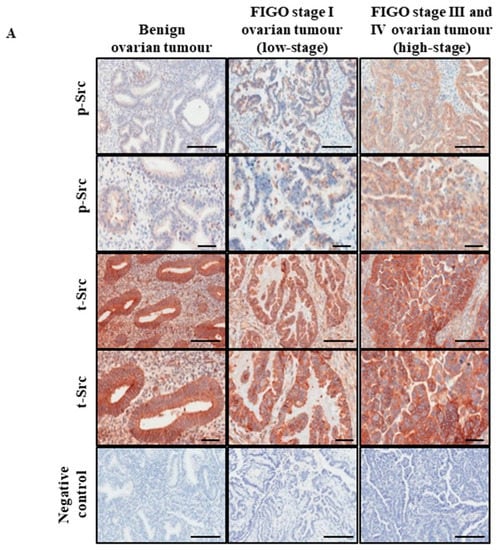 - Huang, Y.W.; Chen, C.; Xu, M.M.; Li, J.D.; Xiao, J.; Zhu, X.F. Expression of c-Src and phospho-Src in epithelial ovarian carcinoma. Mol. Cell. Biochem. 2013, 376, 73–79. [Google Scholar] [CrossRef] [PubMed]