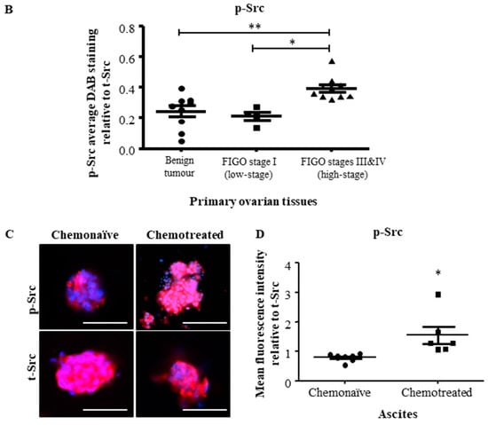 The expression of p-Src was significantly greater in high-stage serous ovarian tumours, compared to low-stage and benign ovarian tumours (Figure 1A,B). The level of expression and activation of Src was assessed by immunofluorescence in non-adherent cell populations derived from ascites of unmatched advanced-stage recurrent serous ovarian cancer patients, previously treated with chemotherapy (n = 6) and advanced-stage chemonaïve serous ovarian cancer patients (n = 8) (Table 2). Activated p-Src protein localized more in the nucleus in ascites-derived cells from recurrent patients, compared to those who were chemonaïve (Figure 1C). The mean fluorescent intensity of p-Src relative to t-Src was approximately 2-folds higher in chemotherapy-treated recurrent patients, compared to chemonaïve patients (Figure 1D).