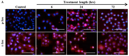 Immunofluorescent studies revealed that there was a nuclear translocation of p-Src from cytoplasm starting at 6 h (Figure 2A). This was more evident at 24 and 72 h of paclitaxel treatment (Figure 2B). However, the cytosolic expression of t-Src remained unchanged across all groups and time points (Figure 2C).