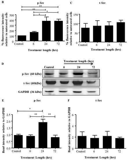 To determine if the activation of Src can be upregulated in ovarian cancer cells in response to chemotherapy and to mimic the profile seen in the ascites-derived tumour cells of chemotherapy treated patients, the HEY ovarian cancer cell line was subjected to IC50 concentration of paclitaxel (0.05 µg/mL) for 6, 24 and 72 h (Supplementary Figure S1). Src expression was assessed by immunofluorescence and western blot analysis.