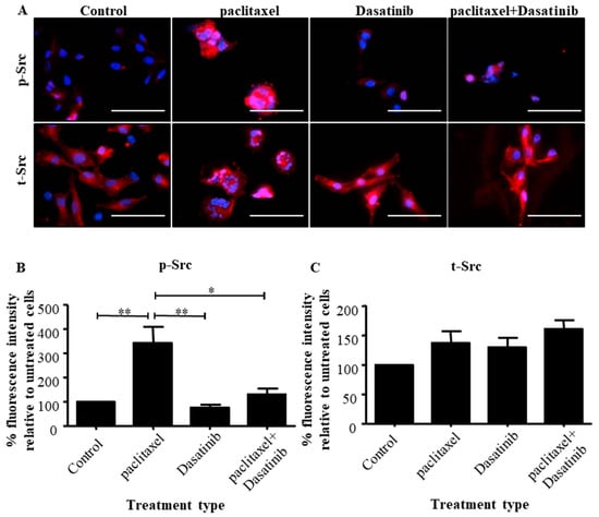 Enhanced intensity of nuclear localisation of p-Src was evident in paclitaxel treated cells compared to control untreated cells (Figure 3A). Quantification of the fluorescent intensity of p-Src proteins showed significant greater levels of activated protein in the paclitaxel treated cells, compared to the untreated group (Figure 3B). Dasatinib treated cells had a similar intensity of p-Src as untreated cells, which was significantly lower than the cells treated with paclitaxel. In addition, the combination of Dasatinib with paclitaxel significantly inhibited p-Src compared to paclitaxel-only treated groups (Figure 3A,B). There was no significant difference in the expression of t-Src between control and treatment groups (Figure 3C).