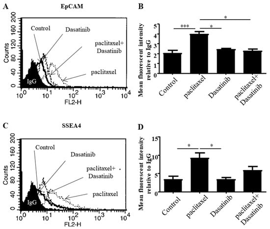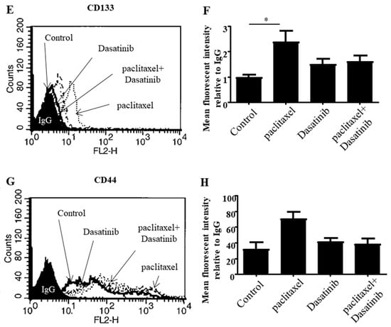 Paclitaxel significantly enhanced the expression of EpCAM in HEY ovarian cancer cell line and it was significantly suppressed by the addition of Dasatinib (Figure 4A,B). SSEA-4 and CD133 CSC-like markers were significantly upregulated by paclitaxel treatment. Even though Dasatinib had a decreasing effect on the paclitaxel-induced expression of these markers it was not significant (Figure 4C–F). Furthermore, there was an insignificant but increasing trend in the expression of CD44 in response to paclitaxel treatment. Dasatinib slightly decreased this effect on the expression of CD44 (Figure 4G,H).