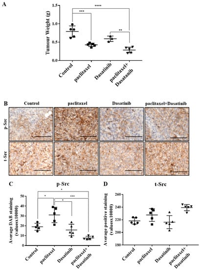To investigate the in vivo anti-tumourigenic effect following the administration of Dasatinib in conjunction with paclitaxel, mice were killed at the 30-day endpoint (12-day of treatment) and their tumour burden was measured. Similar to previously reported results [], upon dissection, multiple tumour deposits were observed in the liver, pancreas and bowels and several smaller tumour nodules were found throughout the peritoneal cavity of control untreated mice. Mice treated with paclitaxel or Dasatinib developed smaller tumour nodules and fewer tumours were found from each mouse compared to control untreated mice. We compared the tumour burden between all mice in the study. Untreated control mice developed the largest tumour burden compared to all groups (Figure 5A). Significantly reduced tumour burden was observed in the group injected weekly with paclitaxel compared to control mice. Mice treated with the combination of paclitaxel and Dasatinib also had significantly smaller tumour burden compared to control animals, however, this was not significantly different compared to paclitaxel-alone treated mice. Daily Dasatinib treatment reduced tumour burden to similar levels observed in the paclitaxel treated mice, however, this was significantly larger than mice treated with combination of the two drugs. Paclitaxel, Dasatinib or a combination of both were well tolerated in mice without any major adverse effects. In line with in vitro results, the tumours generated with paclitaxel alone treatment had significantly higher p-Src protein, which was inhibited significantly by a combination of paclitaxel and Dasatinib treatments (Figure 5B,C). The p-Src levels of combination treated xenografts were significantly lower than control and paclitaxel-alone treated tumours (Figure 5C). The t-Src levels remained relatively unchanged between the experimental groups (Figure 5D).