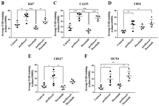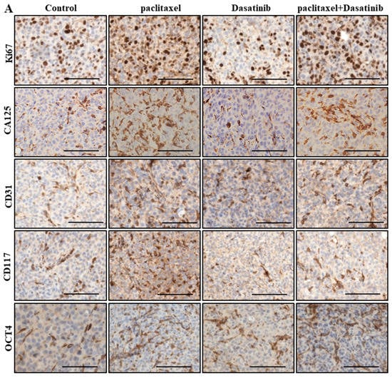 Octamer-binding transcription factor 4 (OCT4) is an embryonic stem cell marker, the expression of which was upregulated in ovarian tumours to enhance cancer cell proliferation, migration and decreased cisplatin sensitivity []. Paclitaxel treatment significantly enhanced OCT4 expression levels in mouse xenografts (Figure 6A,F). Dasatinib only treatment did not induce a marked change in OCT4 expression compared to the untreated control group (Figure 6A,F). In paclitaxel and Dasatinib combined treatment groups, no change in the expression of OCT4 was observed compared to paclitaxel treated group (Figure 6A,F).