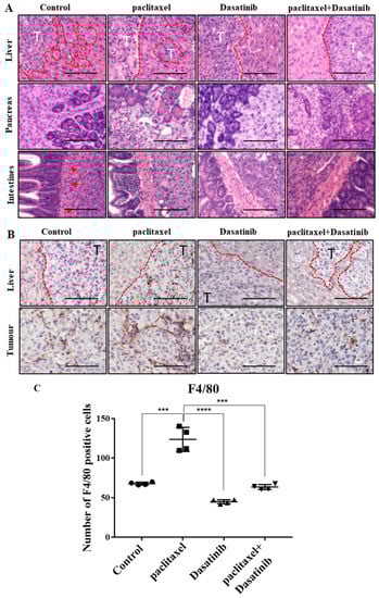 Histological analysis of organs revealed that the induced tumours in the control group, were invasive and appeared to progress through adjacent peritoneal organs. In the liver, some lobes were completely replaced by tumours with further smaller invading frontal lesions (Figure 7A). Similarly, in the pancreas exocrine cells were segmented and in some regions were replaced by large tumour masses. Across all groups, the intestinal tract was the least invaded; however, some mice in the control group showed attachment and invasion into the muscular layers of the small intestines (Figure 7A). In the paclitaxel group, cells in the tumours appeared to be more disorganised than other groups. However, overall there was less penetration into organs, particularly the liver compared to the control group. On the other hand, the tumours treated with Dasatinib had less leading edges invading into the liver (Figure 7A). While some regions of the liver had high tumour presence, there were distinct borders between tumour and liver cells. In this group, there was minimal tumour attachment and invasion into small intestines. The combination treated tumours also revealed a reduced tendency for invasion into organs, particularly liver and pancreas.