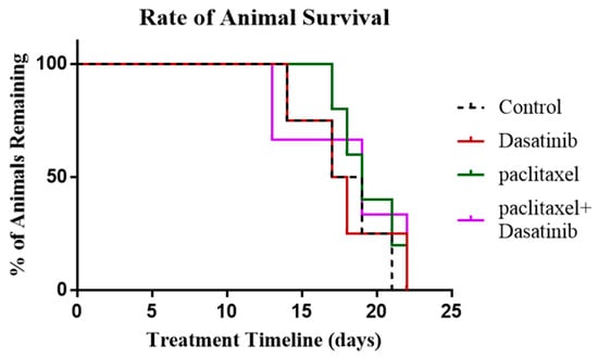 In another set of experiments, 19 days post-i.p injection with HEY cells, mice were divided into three groups based on the treatment given: paclitaxel, Dasatinib, and a combination of paclitaxel and Dasatinib (n = 5/group). All treatments were terminated when control mice reached the endpoint (as described above). Survival of individual mice was monitored with remaining animals until they reached endpoint (Figure 8).