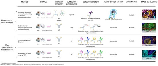 Multiplexed technologies are being used to identify the presence of multiple biological markers on a single tissue sample or an ensemble of different tissue samples []. The multiplexed imagining techniques provide unique biological information that, in many cases, cannot be attained by other non-imaging methods or by single immunohistochemistry (IHC) techniques. As mentioned, individual cells can be accessed with extraordinary fidelity equal to that achievable in the bulk population, such than even rare cell populations can be studied, showing their important role in translational research. This knowledge can be applied in cancer prevention. In this review, we discuss the most recent multiplexed methodologies that can be used to identify simultaneous biomarkers in formalin-fixed, paraffin-embedded (FFPE) tumor tissue samples as well as imaging analysis platforms with potential application for future cancer immunotherapy biomarker discoveries.