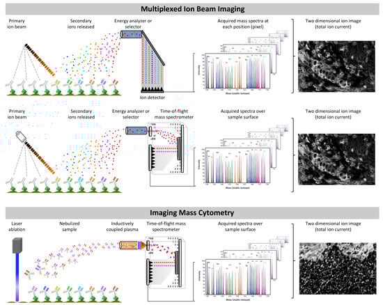Multiplexed ion beam imaging (MIBI) applies the principles of multi-isotope imaging mass spectrometry (MIMS) and the mass-tag strategy with metal-chelated isotopes conjugated to antibodies that will be incubated on the tissue of analysis (Figure 2) []. It allows subcellular imaging resolution. Instead of direct isotope labeling of the target cell or tissue, as described in the previous platforms, MIBI uses specific antibodies to “deliver” a specific mass to the targeted antigen. MIBI combines SIMS fundamentals, stable isotope reporters, specific antibodies, and intensive computation.