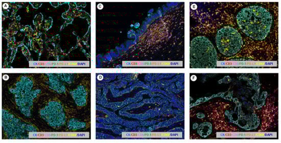 Multiplex immunoflorescencce microphotography. Images representing the immunoprofiling of different tumor types using the multiplexed tyramine signal amplification system: (A) esophageal squamous cell carcinoma, (B) malignant melanoma, (C) lung squamous cell carcinoma, (D) lung adenocarcinoma, (E) colorectal adenocarcinoma, (F) Hodgkin’s lymphoma. Scale bar: 200× magnification.