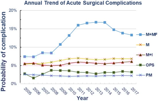 From 2005 to 2017, there was no significant trend change for acute postoperative complications in all patients in the BCT group (PM and OcPs); (p >0.05). However, all categories in the MAST group had increased trends for complication rates as follows: M category 5.4% to 6.8% (p = 0.004), M + I 5.5% to 6.1% (p = 0.02) and M + MF 7.4% to 13.3% (p = 0.01).