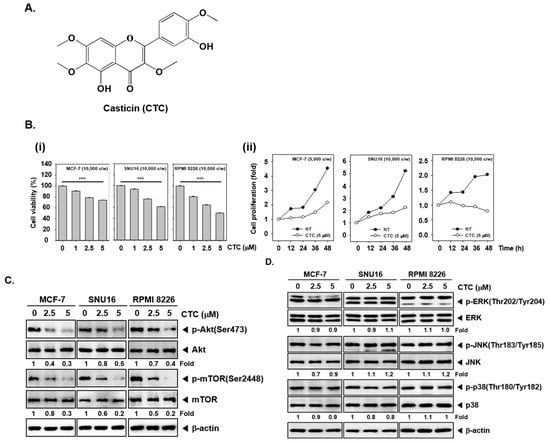 CTC inhibits cell viability and proliferation through Akt/mTOR signaling pathway in several cancer cells. (A) The chemical structure of casticin (CTC). (B-i) Effect of CTC on cell viability. Several cancer cells MCF-7, SNU16, and RPMI 8226 (1 × 104 cells/well) were treated with the indicated concentrations of CTC for 24 h. Thereafter, cell viability was determined by MTT assay. (B-ii) Effect of CTC on cellular proliferation. MCF-7, SNU16 and RPMI 8226 cells (1 × 104 cells/well) were treated with 5 µM of CTC for the indicated times. The cell proliferation was measured using the MTT assay. Abbreviation: NT = non-treated and c/w = cells per wells. (C) Effect of CTC on Akt signaling cascade. The cells were treated with the indicated concentrations of CTC for 9 h. Whole-cell extracts were prepared, and subjected to western blot analysis using antibodies against p-Akt(Ser473), Akt, p-mTOR(Ser2448), mTOR. (D) Equal amounts of lysates were analyzed by western blot analysis as described in panel C above.