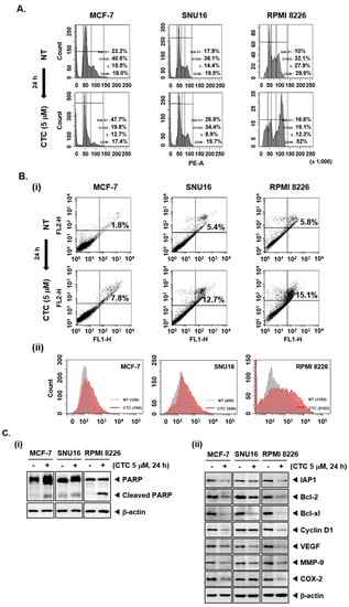 To determine apoptosis, cell cycle analysis was performed using propidium iodide (PI) staining. Briefly the MCF-7, SNU16, and RPMI8226 cells were treated with 5 µM of CTC for 24 h, and then the cells were harvested, washed with cold PBS. Cell pellets were fixed with 70% cold ethanol overnight at 4 °C. The fixed cells were resuspended in 1× PBS containing 1 mg/mL RNase A, incubated for 1 h at 37 °C incubation. Cells were then washed, resuspended, and stained in PBS containing 25 µg/mL of PI for 30 min at room temperature in the dark. Stained samples were analyzed by BD Accuri C6 plus flow cytometer (BD Biosciences, San Diego, CA, USA). Acquisition and analysis of the data were performed using BD Accuri C6 plus software (version 1.0.23.1).