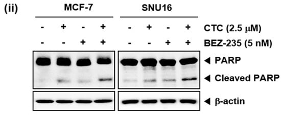 We next determined the percentage of apoptotic cells by the well-established TUNEL assay, which enables the visualization of apoptotic cells using an in situ end-labelling technique that labels DNA breaks in apoptotic cells [51]. As shown in Figure 3C, CTC alone, at 2.5 µM, resulted in 16.7% apoptosis, while treatment with BEZ-235 alone, at 5 nM, led to 14.7% apoptosis. However the combinatorial application of both agents produced a greater effect, resulting in 40.4% apoptosis in MCF-7 cells (Figure 3C-i Top). In SNU16 cells, exposure to CTC alone resulted in 8.1% cell apoptosis, whereas treatment with BEZ-235 alone led to 6.6% cell apoptosis. However, exposure of cells to the combination of CTC and BEZ-235 resulted in 21.9% apoptosis (Figure 3C-i bottom). Furthermore, we observed that PARP cleavage were further increased by the combination treatment of two drugs together (Figure 3C-ii).