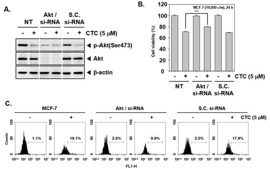 To provide a direct evidence that apoptotic effects induced by CTC are due to inhibition of Akt pathway, transient transfections were carried out using Akt/si-RNA and scrambled si-RNA (control) in MCF-7 cells. The data demonstrated that Akt expression was substantially blocked upon transfection with Akt/si-RNA (Figure 4A). Subsequently, When Akt/si-RNA and scrambled si-RNA transfected MCF-7 cells were treated with CTC for 24 h, cell viability were performed using MTT assay. As shown in Figure 4B, MCF-7 cells transfected with scrambled si-RNA, cell viability were reduced to 69% upon treatment with CTC. In contrast, transfection of CTC-treated cells with Akt/si-RNA slightly inhibited CTC-induced reduction in cell viability as compared to the control group.