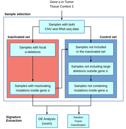 The algorithm is based on the workflow shown in Figure 1: the main inputs of the model are the gene of interest α and the particular tissue context Ʃ (chosen from the available TCGA cohort codes, e.g., ACC and COAD). Next, the inactivated and control sample sets are built. In the first step, only samples for which both CNV and mRNA-seq data are present in the TCGA database are included.