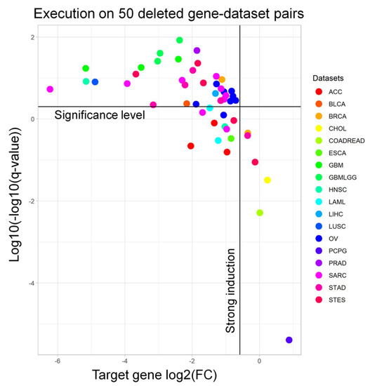 In order to demonstrate the accuracy of our approach, we extracted 50 pairs of frequently deleted genes (and their matching datasets) from the cBioPortal [17] (Tables S1 and S2) to run the workflow with. Afterwards, from the output signature, we extracted the fold change and the adjusted p-value of the target gene to understand whether we are selecting samples in which the target gene is significantly downregulated. Indeed, almost all of the targets are significantly downregulated (94.0%) and have a strong induction (i.e., log2FC < −0.58, meaning a 50% regulation, 93.6%) (Figure 2). We performed a similar benchmarking for the RF results on the same genes. When visualizing the meanDecreaseAccuracy (MDA) and meanDecreaseGini (MDG) of such genes, we observed that only 5/50 (10%) gene-dataset pairs had an MDG higher than 1%, while only 2/50 (4%) pairs showed an MDG over 5% (Figure S1).