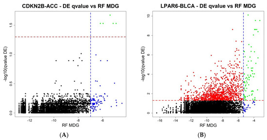 (A,B) Two representative plots of the Differential Expression against the Random Forest analysis on the ICAro system. Blue line: the top 100 genes from the Random Forest analysis, ranked by the meanDecreaseGini (MDG). Red line: the adjusted p-value significance threshold. Left: only a few genes are significantly regulated in the DE analysis, but more can be studied from the top 100 genes on the RF analysis. Right: the opposite situation where most information lies in the differential expression, and just most of the top 100 RF genes are significant in DE terms.