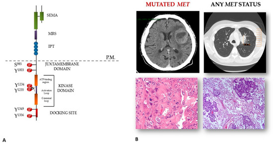 MET activation in brain lesions from non-small cell lung cancer (NSCLC). Panel (A) structure of the MET receptor; panel (B) brain metastases and the matched primary lung mass. The lesions feature similar histo-morphology, but different MET status, with MET mutated cells being only detected in the secondary lesion.