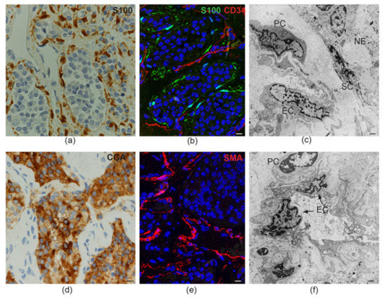 In fact, it is currently assumed that the phenotypic plasticity of PPGL cells is circumscribed within the neuroepithelial lineage, a theory backed by the neuroepithelial-specific loss of SDHB protein in the SDH-related PPGLs, which conforms to the widely accepted two-hit hypothesis of tumor suppressor genes [43,44,45,46]. This would imply that a uniquely neoplastic neuroepithelial cell population drives PPGL growth stimulating angiogenesis and gliogenesis from adjacent normal blood vessels and nerves. Thus, the vascular (endothelial and pericytic) and the glial (sustentacular) PPGL components are relegated to ancillary roles. Such a view is incongruent with the hypothesis that PPGL tumorigenesis could aberrantly recapitulate the histogenesis of the carotid body and of the adrenal medulla [47,48]. Thus, the origin(s) and the nature of PPGL remain undefined and controversial.