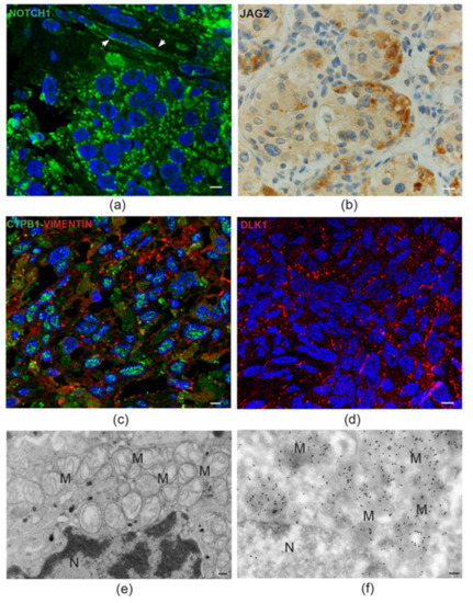 The statistical emergence of Notch signaling rested on five Notch signaling-related genes targeted by recurrent amplifications [22]. These included NOTCH1, prototype of the NOTCH receptor family, JAG2, a NOTCH ligand linked to vasculogenesis and the EMT, HES5, a NOTCH1-activated transcriptional repressor involved in neural stem cells induction [72,73], DVL1, hub of the interactions between Notch and Wnt signaling [74], and CTBP1, a transcription regulator sensitive to the reduced form of nicotinamide-adenine dinucleotide (NADH), that in melanoma cells links NOTCH signaling to the drop of the intracellular NAD+:NADH ratio caused by aerobic glycolysis [75,76]. NOTCH1 signaling is mediated by the NOTCH1 intracellular domain (NICD1), released by proteolysis of transmembrane NOTCH1 after ligand-induced activation, which relocates to the mitochondria and to the nucleus. In the mitochondria NICD1 inhibits BAX and deregulates complex I, an effect that could contribute to explain the deregulation of complex I activity reported in the SDH-mutated PGLs [77,78]. In the nucleus, NICD1 forms a transcriptional regulatory complex with Suppressor of Hairless and Mastermind, which prevents the expression of cell differentiation factors and mediates the HIFA-induced metabolic changes resulting in the Warburg effect [79,80]. Importantly, NOTCH and HIFA signaling are linked in a positive loop: hypoxia promotes NOTCH activation, and NOTCH signaling upregulates HIF2A, the driver of the pseudo-hypoxic phenotype [81]. As investigated using immunohistochemistry, immunofluorescence, and cryo-immuno-EM (Figure 3), the protein products of the top-amplified NOTCH1-related genes were highly expressed in all the PGLs analyzed, independently of CNV status at the respective loci and of presence or absence of germline SDHx mutations [22]. However, for some of these proteins, the levels and the subcellular localizations of the immunostaining varied with cell type. JAG2 was mainly expressed in the sustentacular cells, including their dendritic processes, which establish multiple contacts with the neuroepithelial cells [22]. Membrane NOTCH1 was strongest in the endothelial and sustentacular cells, while mitochondrial and nuclear NOTCH1 was more conspicuous in the neuroepithelial component, where the mitochondria are severely altered and contiguous to the nuclear envelope (Figure 3), suggesting a mitochondrial role in the nuclear delivery of NICD1 [22,56].