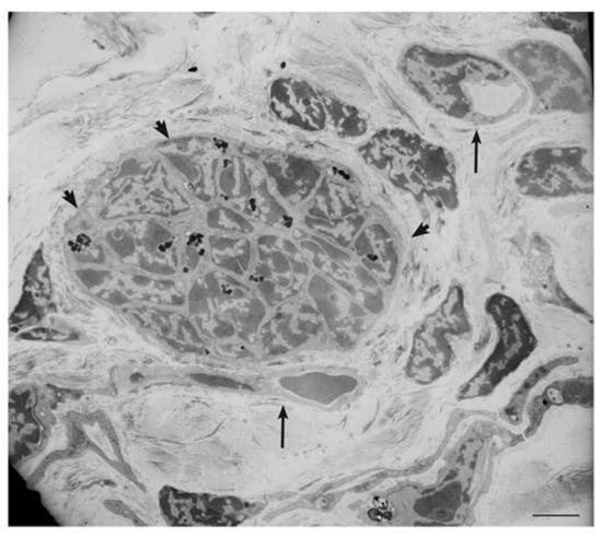 Ultrastructural view of paraganglioma xenograft tissue. The electron micrograph, derived from a xenograft obtained by subcutaneous injection of an immortalized tympano-jugular paraganglioma cell line (PTJ64i), shows a tight neuroepithelial-like cell cluster (arrowheads, dark spots are lipofuscins) in the context of a vasculogenic tissue revealing endothelial-like cells with cytoplasmic hollowing and capillary-like structures (arrows) (bar = 5 µm).