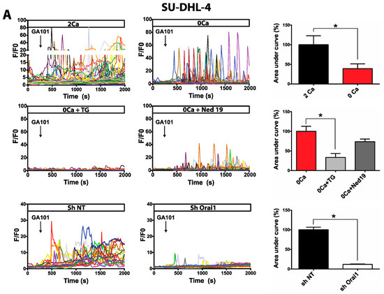 Effect of GA101 on intracellular Ca2+ concentration in SU-DHL-4 (A) and BL2 (B) cell lines. Ca2+ responses to GA101 (10 µg/mL) were measured using Fluo2-Leak Resistant-Acetoxy Methyl ester (Fluo2-LR-AM) Ca2+ dye and recorded by videomicroscopy (Zeiss LSM 510) using a 25× objective. Black arrows indicate GA101 addition. Each trace represents the response of one cell and data are representative of at least three independent experiments. Data were processed using OriginPro 7.5 (Origin Lab) or GraphPad prism. Cells were recorded in extracellular Hank’s Balanced Salt Solution (HBSS) containing 2 mM Ca2+ (2Ca) or in Ca2+-free HBSS (0Ca). Cells were preincubated with 100 nM thapsigargin (TG) for 45 min and recorded in Ca2+-free HBSS (0Ca + TG) or with 10 µM Ned-19 for 1 h and recorded in Ca2+-free HBSS (0Ca + Ned19). Calcium responses to GA101 in cells expressing Non Targeting shRNA (sh NT) or sh Orai1 were recorded in HBSS containing 2 mM Ca2+. Histograms represent areas under curves (AUC) calculated, under various recording conditions, between the application time of GA101 and t = 2000 s; * p < 0.05.