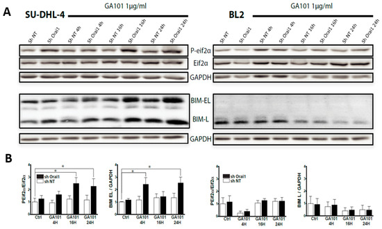 Differential activation of endoplasmic reticulum (ER) stress in SU-DHL-4 and BL2 cell lines. (A) Cells expressing sh NT or sh Orai1 were treated with GA101 (1 µg/mL) for varying lengths of time. After lysis, phosphorylated eukaryotic translation initiation factor alpha (P-eIF2α), eIF2α, and BIM expression levels were assessed by immunoblot analysis. GAPDH was used as a loading control. (B) Quantification of Western blots is given as means ± SE of three to five independent experiments; * p < 0.05.