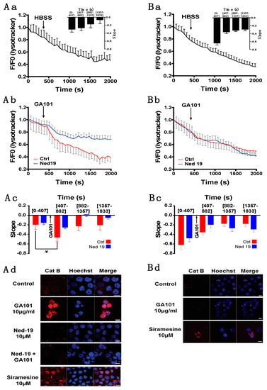Lysosomal membrane permeabilization (LMP) and lysosomal cathepsin B release were assessed by lysotracker staining and immunofluorescence, respectively, and analyzed by fluorescence microscopy. For LMP detection, cells were stained with lysotracker red (100 nM) in HBSS at 37 °C for 45 min. Cells were then rinsed twice in HBSS. Fluorescence micrograph images were obtained using an inverted fluorescence microscope with an ApoPLAN 63× objective. Images were recorded at constant 1-min intervals. Regions of interest corresponding to cells recorded were drawn to analyze the fluorescence signal, and its slope was calculated using GraphPad Prism software.
