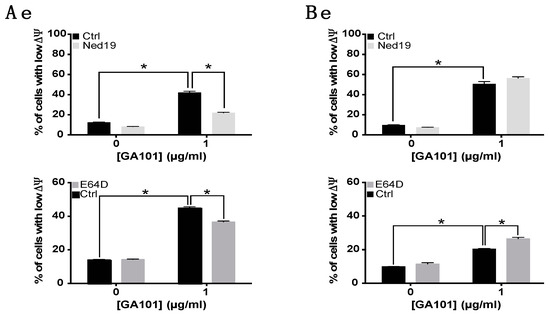 Differential involvement of lysosomal membrane permeabilization (LMP) in (A) BL2 cells and (B) SU-DHL-4 cells. (a) Control recordings of lysotracker fluorescence in HBSS containing 2 mM Ca2+. Insert: Lysotracker fluorescence slope quantification over time. (b) Effect of GA101 on LMP. The fluorescence of lysotracker red DND-99 was recorded by videomicroscopy (Zeiss LSM 510) using a 63× objective. Black arrows indicate HBSS or GA101 (10 µg/mL) addition. Each trace represents the mean ± SE of three independent experiments. After pretreatment (in blue) or not (in red) with Ned-19 (10 µM) for 45 min, cells were recorded in HBSS containing 2 mM Ca2+. (c) Quantification of the lysotracker fluorescence slope before and after the addition of GA101 in BL2 and SU-DHL-4. (d) Confocal microscopy of cathepsin B staining (red). After treatment, BL2 or SU-DHL-4 cells were fixed and stained with anti-cathepsin B, revealed by donkey anti-goat Ab coupled to Alexa 594. Nuclei were counterstained with Hoechst 33258. Siramesine was used as positive cathepsin B release inducer. Scale bar: 10 µm. (e) Effect of LMP induced by GA101 on cell death. Cells were incubated with GA101 in the presence or absence of Ned-19 or E64D for 24 h. Cell death was assessed by measuring the loss of mitochondrial membrane potential (ΔΨm), using TMRM as a fluorescent dye, and then analyzed by flow cytometry; * p < 0.05.