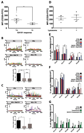 Involvement of Ca2+ influx and LMP in GA101-induced cell death in primary B-Cell Chronic Lymphocytic Leukemia (B-CLL). (A) Relationship between CD20 expression and the effect of GA101 on cell death in primary human B-CLL. Immediately after isolation peripheral blood mononuclear cells (PBMC) were co-immunostained with anti-CD20-FITC and anti-CD19-PE. The mean fluorescence intensity of CD20 was measured by flow cytometry in CD19-positive (CD19pos) gated cells. PBMCs were incubated with GA101 1 µg/mL for 24 h, and cell death was assessed by measuring the loss of mitochondrial membrane potential (ΔΨm), using TMRM as a fluorescent dye, and analyzed in CD19pos cells by flow cytometry. Cells were considered responders when GA101 induced a statistically significant increase in cell death (Mann–Whitney U; p < 0.05 considered as significant). Representative Ca2+ responses to GA101 (10 µg/mL) in CLL involving (B) TG-sensitive (CLL20) or (C) Ned-19-sensitive Ca2+ pools (CLL23) recorded in HBSS containing 2 mM Ca2+ (2Ca), in Ca2+-free extracellular medium (0Ca), after pretreatment with TG (100 nM, 45 min) and recorded in Ca2+-free extracellular medium (0Ca + TG), or after pretreatment with Ned-19 (10 µM, 1 h) and recorded in Ca2+-free extracellular medium (0Ca + Ned19). Histograms represent areas under curves calculated under various recording conditions, between the application time of GA101 and t = 2000 s; * p < 0.05. Ca2+ responses were recorded as described in Figure 1. (D) Relationship between CD20 expression and GA101-induced activation or not of lysosomal Ca2+ release in B-CLL. (E) B-CLL samples showing lysosome-dependent or (F) independent GA101-induced cell death. (G) Effect of ER stress inducer on B-CLL cell death. In GA101-responsive B-CLL samples, cells were incubated with GA101 (1 µg/mL) in the presence or absence of tunicamycin 10 ng/mL for 24 h. Cell death was assessed as described above; * p < 0.05.