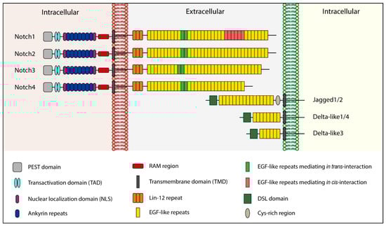 Structurally, the Delta and Jagged ligands are very similar: They lack an intracellular domain, while their extracellular portion is constituted by 6–16 EGF-like repeats [] and a distal Cys-rich region called the Delta/Serrate/Lag-2 (DSL) domain []. The DSL region is responsible for interaction with Notch receptors []. Moreover, Jagged1 and -2 possess a Cys-rich region closer to the membrane []. Unlike Delta and Jagged, the extracellular domain of Notch receptors is organized in 29–36 EGF-like repeats [,] and exists in a Cys-rich region called Lin-12 that noncovalently binds the extracellular Notch with the membrane-tethered intracellular Notch []. The Notch intracellular domain (NICD) is composed of an RBPJK associate molecule (RAM) region, repeated structural motifs named ankyrin repeats (which mediate the interaction between NICD and CBF1, a transcriptional activator), a transactivation domain (TAD), and a PEST domain (involved in Notch degradation) [].