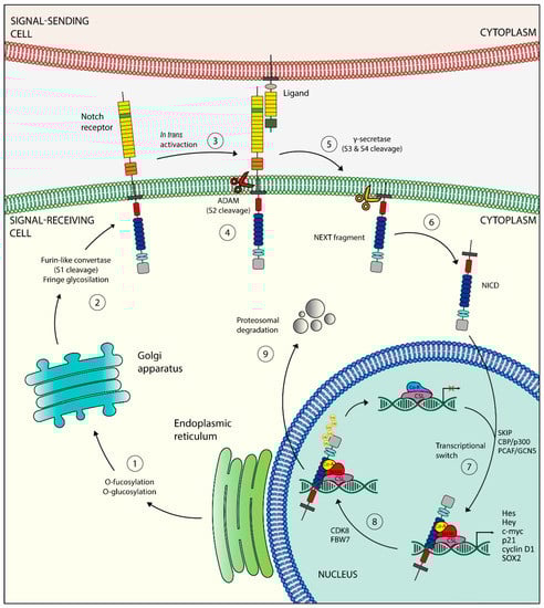 Once in the trans-Golgi, a furin-like convertase proteolytically cleaves the inactive precursor []. This first cleavage site (S1) allows the mature Notch receptor to form, which is able to translocate in the cytoplasmic membrane and interact with its ligands []. The in-trans activation triggers a conformational change in the Notch receptor that exposes the second cleavage site (S2) to a member of the disintegrin and metalloproteinases (ADAM) family (ADAM10 or ADAM17) [,]. The result is a membrane-tethered Notch-truncated (NEXT) fragment [], which is further processed into two sites (S3 and S4) by a presenilin-dependent γ-secretase complex, constituted by presenilin 1 (PSEN1) or PSEN2, nicastrin, presenilin enhancer 2 (PEN2), and anterior pharynx-defective 1 (APH1) [,]. These cleavages release the active form of the NICD into the cytoplasm. The NICD can then translocate into the nucleus [], where it binds several DNA-binding proteins of the CSL family (RBPJK/CBF1/KBPF2 in mammals). The newly formed complex switches from a transcriptional-repressor state to a transcriptional-activator one, recruiting the transcriptional coactivator mastermind-like protein (MAML), the Ski-interacting Protein (SKIP), and histone acetyltransferases CBP/p300 and PCAF/GCN5 [,,]. All these events allow the transcription of transcriptional repressors such as the Hairy Enhancer of Split (Hes) family of proteins and HES-related proteins (Hey) [,], two families responsible for lineage-commitment decisions. Other Notch target genes include p21/Waf1, cyclin D1 and -3, c-Myc, HER2, Notch-regulated ankyrin repeat protein (NRAR), NF-κB, pre-Tα, IGF1-R, survivin, Snail homolog 2 (SLUG), SOX2, and PAX5 [,,,]. The Notch-mediated transcriptional activation ends with the degradation of the NICD. The mechanism consists of the phosphorylation of a degron within the PEST domain of NICD, mediated by cyclin-dependent kinase 8 (CDK8) and targeted for proteasome-mediated degradation by E3 ubiquitin ligases SEL10 (also known as FBW7) [,].