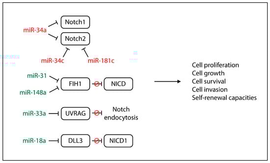 Functional effects of Notch-regulated miRNAs in glioblastoma. Red miRNAs are downregulated while the green ones are upregulated in Glioblastoma cells.
