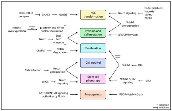 The overexpression of Notch1 promotes AKT activation, which in turn induces the nuclear localization of β-catenin and NF-κB, together with the Notch-mediated overexpression of Snail, Zeb1, and vimentin, promotes cell invasion and migration (Figure 4) []. The crosstalk between Notch and AKT is also mediated by collapsine response mediator protein-5 (CRMP5), preventing Notch degradation and favoring Glioblastoma proliferation []. In addition, CMRP5high Glioblastoma has elevated Hey1 expression compared to CMRP5low Glioblastoma, suggesting CMRP5 as an indicator of poor survival []. Two transient receptor cation channels, TRPM7 and TRPC6, are linked to Notch pathway-stimulating proliferation, invasion, and the migration of glioma cells [,]. In particular, TRPM7 levels correlate with those of Notch1, Jagged1, Hey2, and survivin []. Neurosphere cultures with high Notch1 levels show a more infiltrative phenotype when compared to Notch1low cultures []; furthermore, the suppression of cell migration, tumor invasion, and angiogenesis can be achieved by targeting the urokinase-type plasminogen activator/urokinase-type plasminogen activator receptor (uPA/uPAR) system in order to inhibit Notch-signaling-induced AKT, NF-κB, and ERK pathways []. The oncogenic role of Notch1 can also be due to the infection of human cytomegalovirus, which upregulates Notch1, ATF5 (an anti-apoptotic protein already highly expressed in Glioblastoma), and stem cell markers CD133, nestin, SOX2, OCT4, KLF4, and BMI-1 []. Finally, Wang et al. reported that silencing Notch1 reduced GSC proliferation and oncogenicity in vitro and in vivo [].