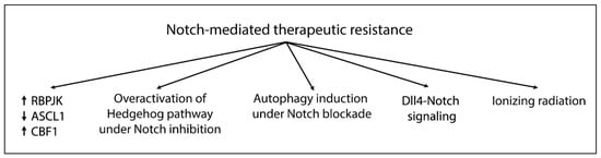 High CBF1 levels are also implicated in drug resistance. Maciaczyk et al. found that targeting CBF1 impairs glioma invasion, suppressing Zeb1, an activator of the epithelial-mesenchymal transition program, and sensitizes cells to drugs other than GSIs. Unfortunately, it was reported that a CBF1 blockade can activate Notch target genes [].