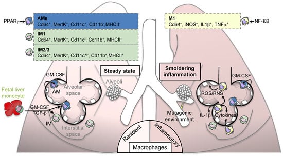 Lung macrophage origin and contribution to “smoldering inflammation”. Left panel: lung-resident macrophages are derived from fetal liver monocytes originating during embryogenesis. The genesis and self-maintenance of macrophages depend on granulocyte-macrophage colony-stimulating factor (GM-CSF) and transforming growth factor β (TGF-β). Four populations of macrophages are present in the lung and are defined by their locations and expression of specific cell surface markers (please refer to boxes): alveolar macrophages (AMs) reside in the airspaces of lung where they self-renew thanks to GM-CSF-expressing alveolar cells. AMs express peroxisome proliferator-activated receptor γ (PPARγ) to maintain lipid homeostasis most likely required for surfactant lipid recycling. Three interstitial macrophage (IMs) populations are located in the lung interstitium and have potential immunoregulatory properties. Right panel: upon exposure to irritant particles or chronic inflammation, macrophages can be primed into an inflammatory M1 phenotype participating to a “smorldering inflammation”. This inflammation is illustrated by the secretion inflammatory cytokines such as interleukin-1β (IL-1β) or tumor necrosis factor α (TNFα) that are under the control of the transcriptional factor NF-kB and the production of reactive oxygen or nitrogen species (ROS/RNS) that favor the induction of somatic mutations in surrounding epithelial cells.