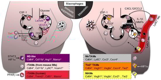 Macrophage effector functions as part of the 7th hallmark of cancer. Right panel: In established tumors, tumor-associated macrophages (TAMs) are the major part of the immune infiltrate that constitutes the tumor microenvironment (TME). Malignant cells produce the colony stimulating factor 1 (CSF-1), which participates to the conversion of tissue-resident macrophages into resident-TAMs (rTAMs). Their origin and cell surface makers may differ between mice and humans, with PPARγ being highly expressed in human rTAMs. Tumor cells also produce lactate through anaerobic glycolysis referred as the “Warburg effect” that can feed cancer cells in a cell-autonomous fashion for proliferation or act in a paracrine fashion to stabilize the hypoxia-inducible factor 1α (HIF1α) and promote a non-classical “M2-like” macrophage polarization. The signal transducer and activator of transcription 3 (STAT3) is another key transcription factor of M2 polarization. These M2-like macrophages participate to the tumor growth through at least 4 mechanisms: (1) secretion of the angiogenic vascular endothelial growth factor A (VEGFA), (2) expression of the immune checkpoint programmed death-1 (PD-1), (3) defect in recognizing and phagocytosing CD47-expressing tumor cells and (4) immunosuppression through inhibition of Th1 helper cells (Th1) and recruitment of regulatory T cells (Treg). Left panel: TAMs are also involved in more chaotic metastatic tumors. A feed-forward loop between CSF-1-expressing tumor cells and EGF-expressing TAMs contributes to intensive proliferation and oxygen consumption leading to a hypoxic environment. Tumor cells also secrete chemokine ligands such as CXCL12 and CCL2, involved in the recruitment into the tumor site of newly monocyte-derived TAMs (MoTAMs) from circulating Ly6Chi monocytes contributing to the expansion of the tumor and the hypoxic niche. Hypoxia within tumor nest alters tumor cells and surrounding MoTAMs promoting extracellular matrix (ECM) remodeling through secretion of IL-1β and metalloproteases (MMPs). This remodeling favors the “angiogenic switch”. A population of Tie2+ TAMs, which most likely derives from a subpopulation of circulating Ly6Clo monocytes, is located within the tumor vasculature interacting with mammalian-enabled (MENA)-expressing tumor cells and endothelial cells to further promote angiogenesis and create a metastatic environment. Circulating Ly6Clo monocytes also scavenge tumor materials to prevent tumor invasion whereas metastasis-associated macrophages (MAMs) allow the extravasation of tumor cells into the lung.