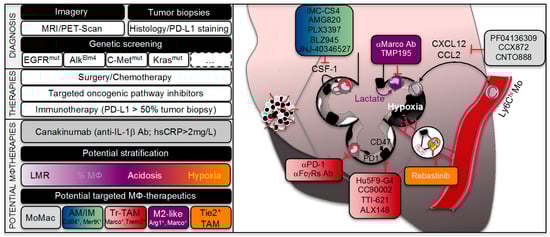 Lung adenocarcinoma treatment and emerging therapeutic potential of targeting macrophages. Diagnosis of lung adenocarcinoma patient requires at first magnetic resonance imaging (MRI) or positron-emission tomography scan (PET-scan). Tumor biopsies were also performed to further characterize the histology of the tumor and to determine the cancer cell’s origin, the disease progression, and the expression of PD-L1 among other features. Oncogenic mutations driving lung adenocarcinomas were screened, of which V-KI-ras2 Kirsten rat sarcoma viral oncogene homolog (KRAS) and epidermal growth factor receptor (EGFR) mutations were the most frequent. These different diagnoses allow personalized treatment options with targeted oncogenic pathway inhibitors and/or chemotherapy. Immunotherapy is highly patient-dependent since the treatment with a checkpoint inhibitor that targets the PD-1/PD-L1 pathway requires tumors expressing levels of PD-L1 higher than 50%. These therapies are generally not exclusive and different strategies are employed for a better healing without remission. Novel potential therapies are aimed at targeting tumor-associated macrophages (TAMs). Whether or not IL-1β inhibitory antibody (Canakinumab) targets macrophages, its use on patients with C-reactive protein (CRP) levels higher than 2 mg/L reduced the rate of lung cancer. Composition of the tumor microenvironment (TME) may allow patient stratification. For instance, lymphocyte-monocyte ratio (LMR), a prognostic factor and a predictor survival, could be modified with CCR2 inhibitors (PF04136309 or CCX872) or with CCL2 inhibitors (CNTO888), preventing the recruitment of circulating Ly6Chi monocytes into tumors. To limit the conversion of tissue-resident macrophages (i.e., alveolar macrophages AMs and interstitial macrophages IMs) into TAMs, blocking antibodies anti-CSF-1R (IMC-CS4 or AMG820) and tyrosine kinase inhibitors (PLX3397, BLZ945 or JNJ-40346527) are used. Cancer cells express CD47 on their surface, known to be a “don’t eat me” signal and recognized by SIRP1α expressed on macrophages, which triggers a cascade of events that inhibit phagocytosis: anti-CD47 (Hu5F9-G4 or CC90002) or competitive recombinant SIRP1αFC (TTI-621 or ALX148) are developed as a way to reeducate TAMs for eliminating cancer cells. As for T-cells, TAMs also express the immune checkpoint receptor PD-1, inducing immune tolerance and TAMs PD-1 expression reduced the phagocytic potency against tumor cells. Immunotherapy with the use of αPD-1 not only targets PD-1/PD-L1 pathway on T-cells but is efficient to reactivate phagocytic potency of macrophages. However, TAMs could limit anti-PD-1 therapeutic benefits by stealing and capturing αPD-1 antibody from the CD8+ T-cells via FcγRIIb/III receptors unless if αFcγRs antibodies are administrated before. Another way to reeducate TAMs is to convert M2-like macrophages to an antitumor phenotype in targeting MARCO (αMarco Ab) or in inhibiting histone deacetylase (TMP195) to reprogram macrophage-dependent T-cell immune responses. Rebastinib reduced cancer cell metastasis by inhibiting a specific Tie2+ TAMs population implicated in the angiogenic switch.