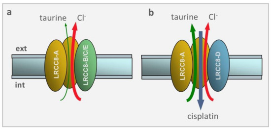 - Planells-Cases, R.; Lutter, D.; Guyader, C.; Gerhards, N.M.; Ullrich, F.; Elger, D.A.; Kucukosmanoglu, A.; Xu, G.; Voss, F.K.; Reincke, S.M.; et al. Subunit composition of VRAC channels determines substrate specificity and cellular resistance to Pt-based anti-cancer drugs. EMBO J. 2015, 34, 2993–3008. [Google Scholar] [CrossRef] [PubMed]