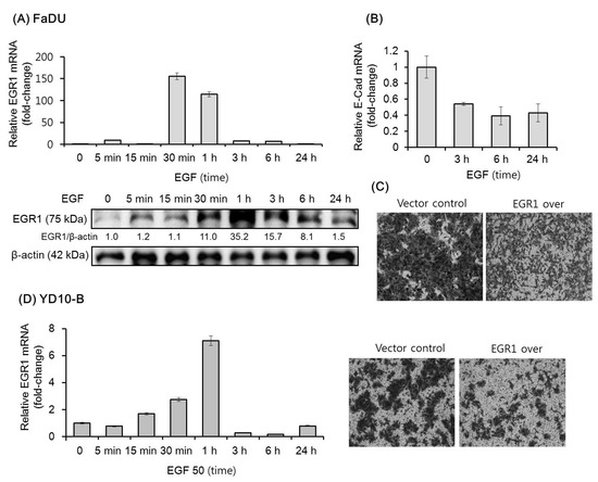 The effect of EGF on the expression of EGR1 in FaDU and YD-10B cells was evaluated by qPCR and/or Western blot analysis. In FaDU cells, EGR1 mRNA and protein expression increased remarkably within 30 min of EGF treatment, then reverted to original levels after 24 h (Figure 1A). As expected, EGF downregulated the expression of E-cadherin mRNA within 3 h (Figure 1B). A previous study showed that EGF increases the invasion of ovarian cancer cells through EGR1 upregulation [28]. We thus investigated the effect of exogenous EGR1 overexpression on FaDU cell invasion. As shown in Figure 1C, FaDU cells overexpressing EGR1 showed decreased Matrigel invasion as compared to that in control cells. Similar results in terms of EGF-dependent EGR1 upregulation and the effect of EGR1 on Matrigel invasion were observed with YD-10 B cells (Figure 1D).