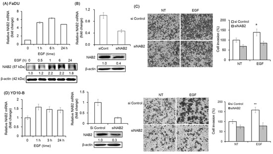 We then analyzed the mRNA and protein expression of NAB2, a co-repressor of EGR1, under the same experimental conditions. EGF was found to upregulate the mRNA and protein expression of NAB2 within 1 h (Figure 2A). To evaluate the effect of NAB2 on EGF-dependent cell invasion, cells transfected with a specific siRNA mixture targeting NAB2 were pretreated with EGF (Figure 2B). Interestingly, siNAB2 transfection for 48 h significantly decreased EGF-dependent Matrigel invasion in FaDU and YD-10B cells (* p < 0.01 and ** p < 0.005, respectively; Figure 2C,D).