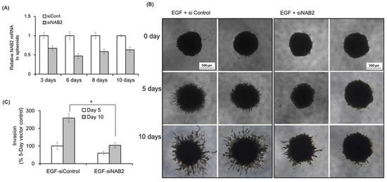 Next, we evaluated the effect of NAB2 on Matrigel invasion using FaDU spheroids. Figure 3A shows the downregulation of NAB2 mRNA in FaDU spheroids after siNAB2 transfection for 10 days in 96-well plates. Figure 3B shows representative images of Matrigel invasion under the same conditions. After 10 days, the spheroids treated with siNAB2 transfection showed a significant decrease in Matrigel invasion in response to EGF (* p < 0.05; Figure 3C).