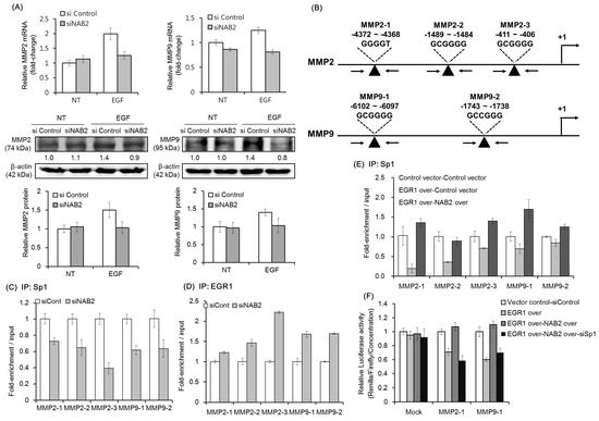 As shown in Figure 4A, EGF treatment was found to upregulate the mRNA and protein expression of MMP2 and MMP9 in FaDU cells. However, siNAB2 pretreatment diminished the EGF-dependent upregulation of both MMPs. An earlier study showed that NAB2 modulates the expression of EGR1-target genes via a direct interaction with EGR1 [29]. Therefore, we used ChIP-qPCR to evaluate if NAB2 affects the competitive binding of Sp1 and EGR1 to the promoters of target genes. Figure 4B shows a schematic representation of the promoter regions containing consensus EGR1/Sp1-binding sites (black arrowheads), which were detected using the AliBaba 2.1 program. As shown in Figure 4C, Sp1 binding to the consensus sequences of the MMP2 and MMP9 promoters was decreased in NAB2-knockdown FaDU cells. In contrast, EGR1 binding to the same promoter sequences was increased under the same conditions (Figure 4D). Furthermore, transient overexpression of EGR1 decreased Sp1 binding to the consensus sequences of MMP2 and MMP9 promoters. However, co-overexpression of EGR1 and NAB2 recovered Sp1 binding to the promoter regions (Figure 4E). To further evaluate the effect of EGR1, NAB2, and Sp1 on MMP2 and MMP9 promoter activity, we performed promoter luciferase assays after modulating the expression of these three genes. As shown in Figure 4F, MMP2 and MMP9 promoter activity decreased with EGR1 overexpression but was recovered with NAB2 overexpression. However, Sp1 knockdown with the co-overexpression of EGR1 and NAB2 decreased the activities of these promoters, supporting the ChIP data.